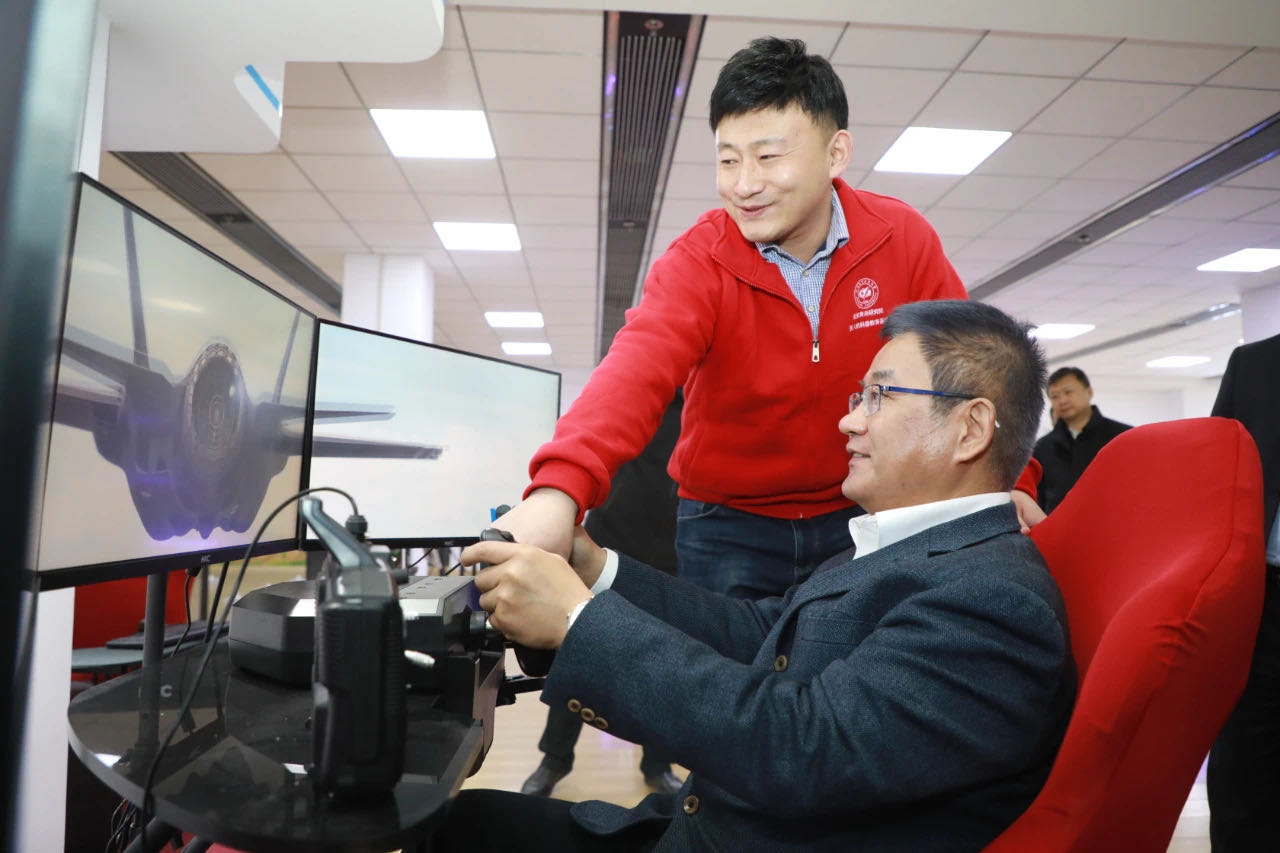 在北航青岛研究院,孙海生先后参观了研究院展厅、虚拟现实研究院(山东省虚拟现实制造业创新中心)展厅、空天地海大数据技术应用中心及航空航天 STEAM教育培训基地,并进行了亲身体验。
